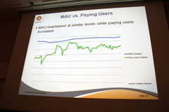 Facebook Creditの導入によって,課金ユーザーは激増している。月間アクティブユーザーには変化がないが,ユーザーあたりの月間課金金額は向上しているそうだ。