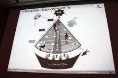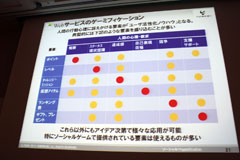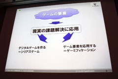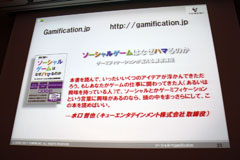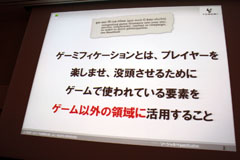 筆者個人的には,ゲーミフィケーションという言葉は2009年頃から主にアメリカの講演で耳にするようになっている。2011年現在,CEDECにおいてゲーミフィケーションを明確に謳ったセッションがこのショートセッション1本だけだったという事実には,若干の戦慄を覚えずにはいられない。
