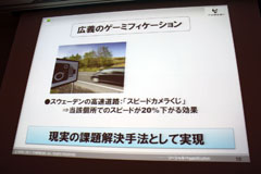 広義のゲーミフィケーションとして,深田氏はスウェーデンの「スピードカメラくじ」を挙げる。これはスピード違反を取り締まるためのシステムで,スピードカメラで測定した速度が規定速度以下だった運転手に対し,一定の確率で報奨金を出すというシステムだ。報奨金はスピード違反の罰金から支払われるので,行政コストはほとんど増加しない。このシステムによって,スピードカメラくじを設置した区域において,運転速度は20%低下したという。