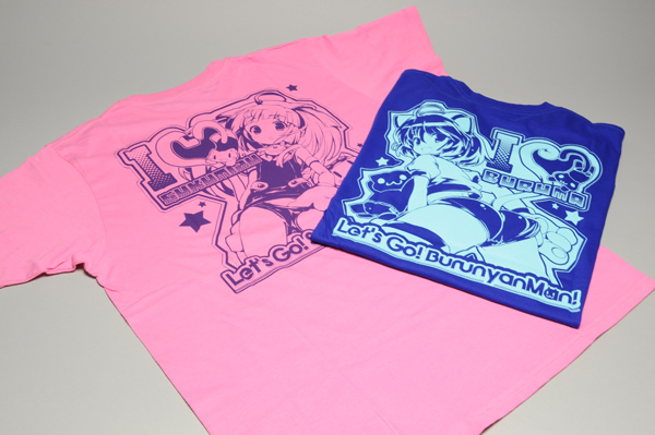 シューティングゲーム「それゆけ! ぶるにゃんマン Portable 〜とりもどせ!あいとせいぎときぼうのつにゃ缶〜」(PSP)のTシャツ2種類セットです。“ブルマ命”と書かれたブルーのTシャツと,“スク水魂”と書かれたピンクのTシャツをセットで(サイズ:いずれもXL)。