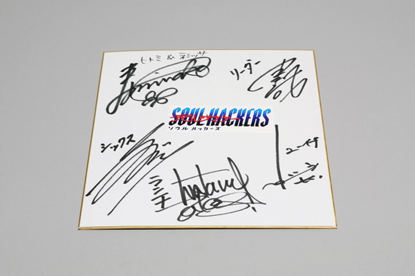 RPG「デビルサマナー ソウルハッカーズ」(3DS)メインキャストのサイン入り色紙です。ヒトミ&ネミッサ役の寿 美菜子さん,スプーキー役の中井和哉さん,シックス役の小野大輔さん,ランチ役の高木 渉さん,ユーイチ役の梶 裕貴さんのサインが書かれています。