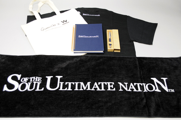 オンラインRPG「Soul of the Ultimate Nation」(PC)のオリジナルグッズです。トートバッグ(サイズ:約35×30cm),Tシャツ(Mサイズ),A5ノート,タオル(サイズ:約96×34cm),ボールペンのセットとなります。