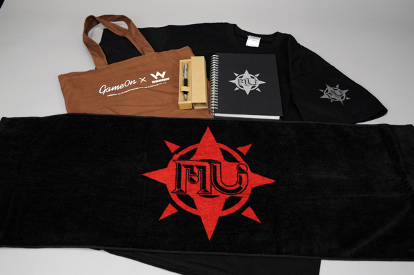 MMORPG「ミュー 奇蹟の大地」(PC)のオリジナルグッズセットです。トートバッグ(サイズ:約35×30cm),オリジナルTシャツ(Mサイズ),ノート,タオル(サイズ:約96×34cm),ボールペンをお届けします。