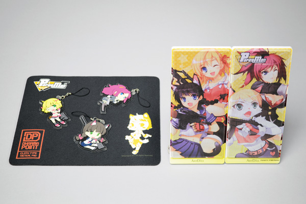 オンラインFPS「ペーパーマン」(PC)のグッズです。デフォルメされたキャラクター3人(ミリィ,ティナ,リカ)がモチーフとなったラバーストラップと,スピーカー,DHARMAPOINTとのコラボマウスパッドをプレゼントします。