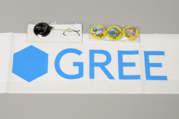 「GREE」で配信されているタイトルのグッズです。「釣り★スタ!」の缶バッチと,「サーガ・オブ・ファンタズマ」のストラップクリーナー,GREEのロゴがデザインされた手ぬぐい(サイズ:約40cm×100cm)をセットでプレゼントします。