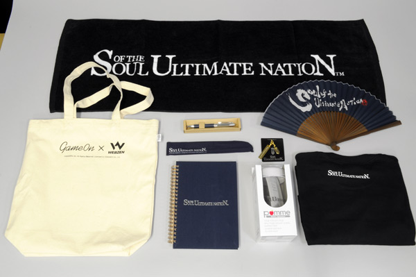 オンラインRPG「Soul of the Ultimate Nation」のオリジナルグッズです。トートバッグ(サイズ:約35×30cm),Tシャツ(Mサイズ),A5ノート,タオル(サイズ:約34×96cm),扇子,ボールペン,お風呂でも使えるiPod向けスピーカーのセットとなります。