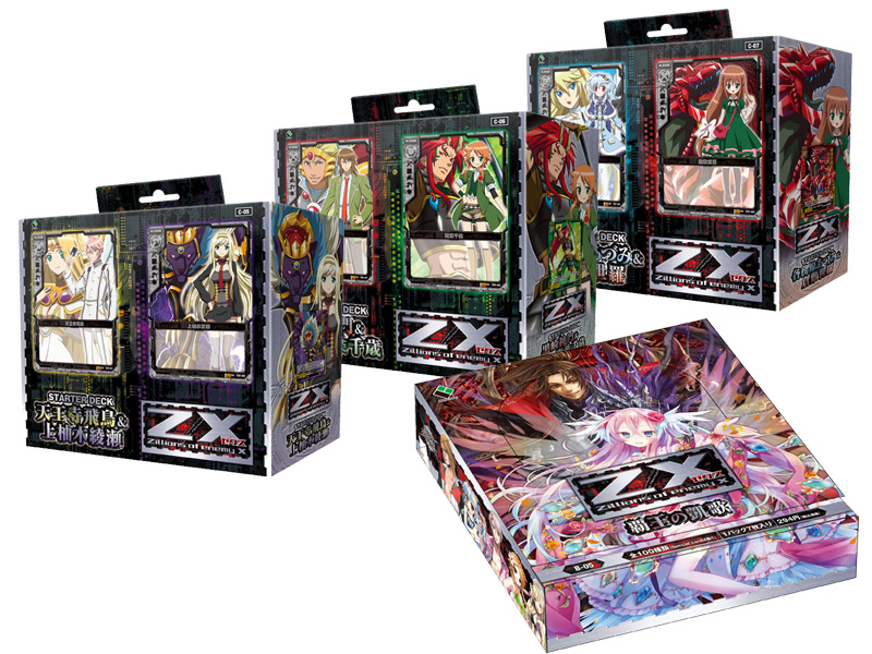 トレーディングカードゲーム「Z/X -Zillions of enemy X-」のスターターデッキ「黒崎神門&青葉千歳」「天王寺 飛鳥&上柚木 綾瀬」「各務原 あずみ&倉敷 世羅」と,ブースターパック「覇王の凱歌」(1BOX)をセットでお届けします。