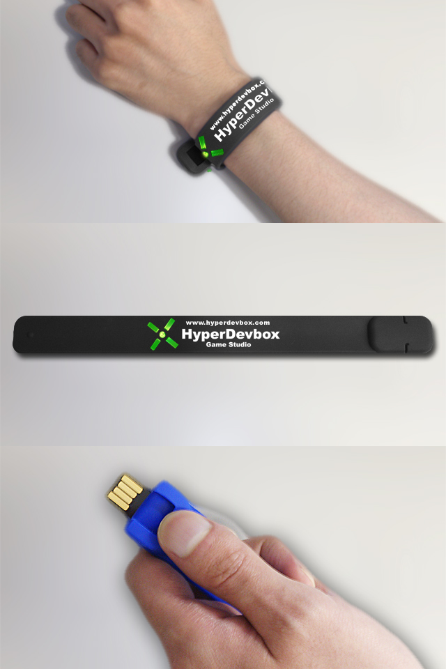 Android向け3Dレーシングゲーム「Indy500 Arcade Racing」などを配信する,HyperDevbox Japanのロゴが入ったブレスレット型USBメモリ(容量4GB)です。クルンと腕に巻き付きます。