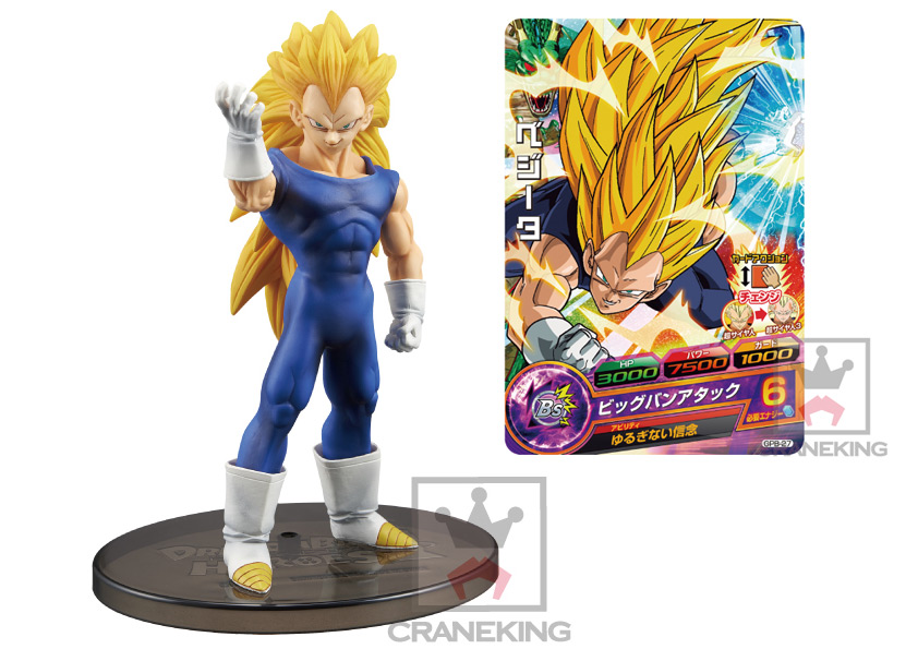 アーケードゲーム「ドラゴンボールヒーローズ」のカードが1枚付属するフィギュアです。シリーズ第2弾の「超サイヤ人3ベジータ」をお届けします。フィギュアのサイズは高さ約14cmとなります。