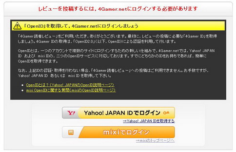ちなみにOpen IDを使った認証とは,Yahoo! JAPANやmixiなどのサイトに移動してログインする仕組みなので,4Gamerには,Yahoo! JAPANまたはmixiにログインするときに使用するID/パスワードの情報は一切通知されません(あくまでOpen IDのみ4Gamer側に通知されます)。そのほか,Open IDの詳細については各対応サイトでご確認ください。