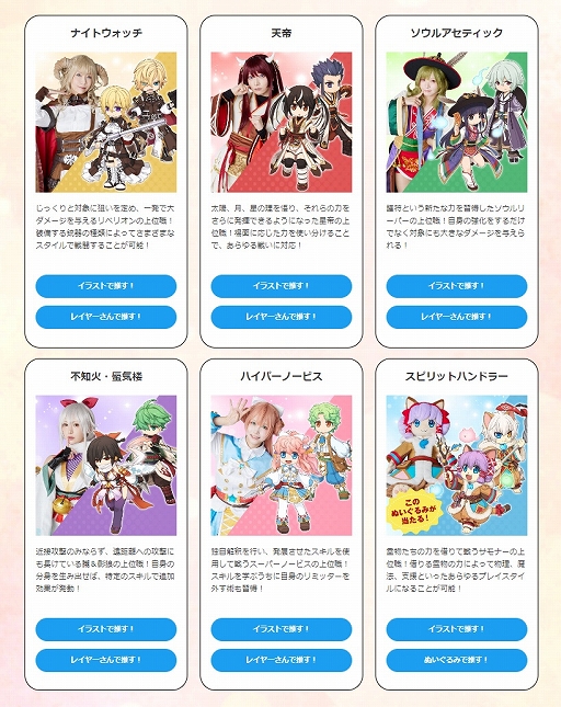 本キャンペーンサイトでは、「拡張4次職」の新衣装を身にまとう、コスプレイヤーのよきゅーんさん(職業:ナイトウォッチ)、篠崎こころさん(職業:不知火)、宮本彩希さん(職業:天帝)、茉夏さん(職業:ソウルアセティック)、えい梨さん(職業:ハイパーノービス)が登場。「スピリットハンドラー」は、高さ約70cmのリアルサイズ(?)に作られたオリジナルぬいぐるみです。