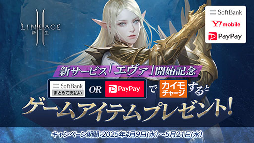 期間中、リネージュ2 エヴァサービス開始を記念して、ソフトバンクまとめて支払いまたはPayPayで3000円以上カイモチャージすると、もれなくリネージュ2で使用できるゲームアイテムがもらえます。