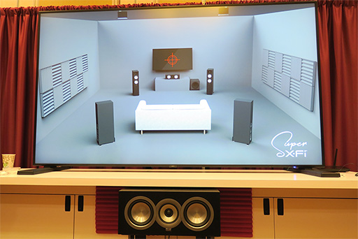 また,筆者が驚かされたのは,モノラルの音楽(=非サラウンド音源)を仮想サラウンド化するというデモだ。Super X-Fiをオフにすると,頭の内部で音に定位するのだが,Super X-Fiをオンにすると,音源の位置が頭の中ではなく前方から,まるで小さなライブ会場に立っているような感じで聞こえるのだ。これは最近のサラウンド機器で可能になった音源の表出化(Externalization)による効果だが,これにはほかの参加者も一様に驚いた様子であった。