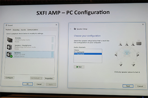 デモルームには,スピーカーによる7.1chサラウンドシステムが設置されており,スピーカーから流れるサラウンドサウンドと,SXFI AMPによる7.1chバーチャルサラウンドサウンドの違いがあるかを体験できるようになっていた。