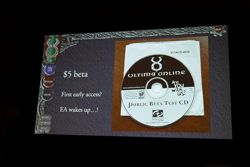 もともと開発予算は少なかったために,プレイテストのアイデアとして思いついたのが,「公式サイトで5ドルを支払ったファンにβ版を送る」という仕組みだ。ギャリオット氏は,「世界最初のアーリーアクセス版」と笑っていたが,開発途中のゲームを売るという前代未聞の事情だったにも関わらず,数日後には公式サイトの登録ページに5万人分もの応募が集まることになる。これを見てElectronic ArtsもようやくUltima Onlineのポテンシャルに気付き,「Ultima IX」の同時開発を一時中断。それまで10人でずっとβ版まで作り上げてきた開発チームに,正式ローンチの3か月前になってから,40人ほどのメンバーが配属された。