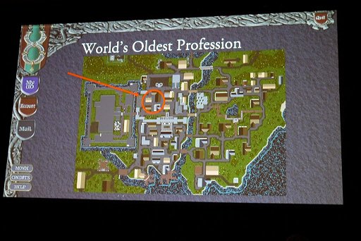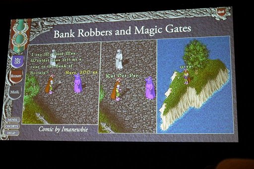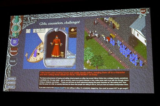 この後は,βテストやローンチ直後の段階で発生した,様々なチーティングやコミュニティの動向が紹介されていった。例えば,Origin Systemsが設定した職業以外にプレイヤーが生み出したゲーム最古の職業ギルドは,鍛冶屋でも家具職人でもなく,何を隠そう“売春”である。「サイバーしたい?」(Do you want cyber?)と聞かれて元締めにお金を払い,本来なら入れないはずの倉庫の中に入ると,そこで待機していた女性キャラクターが服を脱ぎ,卑猥な言葉を発しながら礼のポーズをする,といったものだったが,これが大きな問題になったのは分かるだろう。