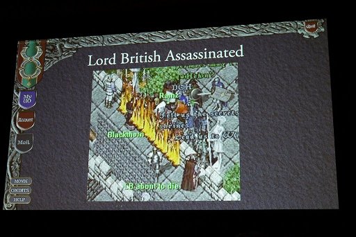 最後のトピックとして挙げられたのが,β版のプレイヤーの間では語り草になっている“ロード・ブリティッシュ”の死である。その経緯は有名だが,改めてギャリオット氏は,「正式ローンチも終わりのころ,ブラックソーンとロード・ブリティッシュが一緒に連れ立って,プレイヤー達とコミュニケーションを取りながら,正式版のローンチが近いことや,βテストへの参加に感謝してブリタニアの各地をまわっていました。それまでゲーム世界に登場すると,様々なプレイヤー達が何とか我々をキルしようと,スペルを使ったりオブジェクトを利用してバグを発生させたりと挑戦していましたが,我々はゴッドモードを使っていましたから,この頃にはプレイヤーも悪さをしようとさえしなくなっていました」と解説する。