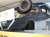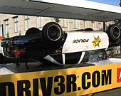さて,そんな世界観がストレートに表現されたアドトラックは,なんと中央にクラッシュしたパトカーを乗せて走行する(写真参照)。パトカーのフロントガラスにはひびが入り,また車の至るところに散弾の跡が残っているという,激しいアクションを想像させるデザインだ。こんなアドトラックが街中を走っているのだから,皆釘付けになること必至だろう。