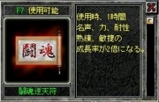 「闘魂逆天符」。使用すると、1時間 名声、力、耐性、熟練、敏捷の成長率が2倍になる。(軍閥符と同時使用不可) |