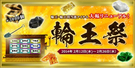 本日2014年2月12日(水)のアップデートより実施されたスロットアトラクション「輪王」の当選アイテムリストリニューアルを記念した「輪王祭」を開催いたします。生まれ変わった「輪王」をプレイするなら今がチャンスです。
