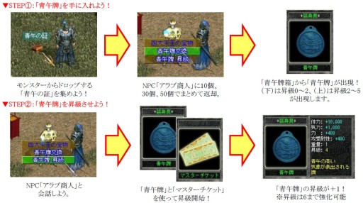 期間中、モンスターを倒すと一定の確率で手に入る「青午の証」を集めてNPC「アラブ商人」に返却すると「青午牌箱」が手に入ります。こちらの「青午牌箱」から“昇級0〜5”の「青午牌」が出現し、その「青午牌」をアイテム「マスターチケット」で昇級させることで様々な能力をアップするアイテムとなります。 「青午牌」を最大昇級6まで上げることができれば、イベント終了後でも使用することが可能です(※昇級5以下の「青午牌」は、イベント終了後に削除いたします。「マスターチケット」は、期間中モンスターを倒すことでドロップします)。