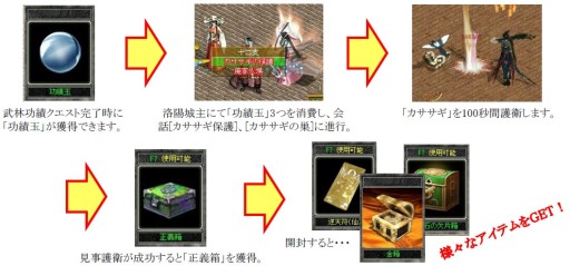 河南省洛陽城の役所(座標:90,225)より受けることができる「武林功績」クエストをクリアすることで手に入る「功績玉」を3つ使用し受領できる「カササギの保護」クエストで見事クリアすることができれば、様々なアイテムが入手できる「正義箱」が貰えます。