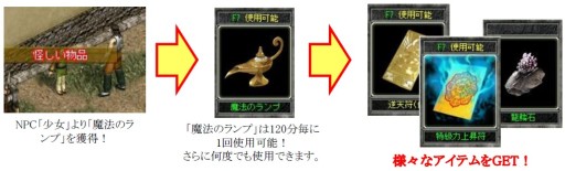 期間中、洛陽城に現れるNPC「少女」に話しかけると「魔法のランプ」を手に入れることができます。こちらの「魔法のランプ」を使用すると様々なアイテムが手に入ります。「魔法のランプ」はゲームに120分接続している毎に1回使用可能となり、何度でも使うことができます。
