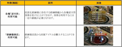 「民営修練場」とは、“休息”や、“修練”といった機能を持ち、競売で手に入れることができる「邸宅システム」を廃止し、その「邸宅システム」の1つの機能であった「修練場」を全プレイヤーが利用できるようになるシステムです。「民営修練場」は全部で30か所用意され、「修練場」を所持しているプレイヤーは、他のプレイヤーに解放する代わりに使用する際の「使用料」等を設定することができるため、「修練場」を経営することができます。