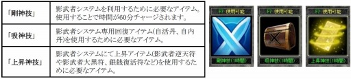 ゲーム中にパソコンから離れていても自動で修練を行う「影武者システム」を使用すると1日1回、NPC「道士」より1時間、「影武者システム」の利用可能時間を延長するアイテム「剛神技」をもらうことができましたが、本アップデートから「剛神技」以外にも専用の回復アイテムを使用できるようになるアイテム「吸神技」と、影武者逆転符・影武者大黒符などの上昇系アイテムを使用できる「上昇神技」も手に入ります。