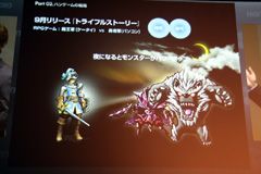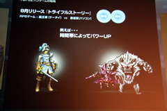 リアゲーのもう1つの例として紹介されたのが,2010年内サービス開始予定のRPG「トライフルストーリー」(PC/モバイル)だ。モバイルユーザーは「魔王軍」,PCユーザーは「勇者軍」となり,ゲーム内で互いに対立する。このゲームでも,現実の時間や地域に応じて,ゲーム内にさまざまな変化が訪れるとのこと。例えば,昼間は勇者軍がパワーアップするが,逆に夜は魔王軍が有利になったり,あるいはリアルの地域ごとに出現するモンスターが異なったりといった感じだ。