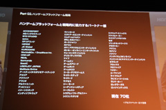 会場では,こうしたハンゲームの動きに賛同するゲーム関連企業70社の社名も公開された。その代表として登壇したのが,スクウェア・エニックスのエグゼクティブ・プロデューサー 三宅 有氏,およびプロデューサー 渡辺範明氏だ。三宅氏は,30名前後いるスクウェア・エニックスのプロデューサーのうち,もはやパッケージタイトルのみに携わっている人材はおらず,何らかの形でオンラインに関わっていることを明らかにし,同社がオンラインゲームに積極的に取り組んでいることをアピールした。