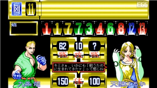 『装甲格闘伝ファイティングナンバーズ』は、1995年に発売されたブックタイプのDS#7に収録されていたカードゲーム。1対1の格闘を意識したカードゲームとなっていて、プレイヤーは1から13の番号が付いた4色のカードを使って役を作り、対戦相手と戦うことになります。基本的にはマージャンのような役を作ってダメージを与え合うシステムなので、プレイ時間は少々長めになりますが、テンポのよいBGMや、要所ではキャラクターが掛け合いをするなど、プレイを中だるみさせない工夫も凝らされています。