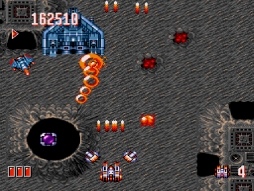 ゲームに登場するアイテムは攻撃力を強化してくれる「P」、ダメージを回復してくれる「E」の他、「パープル」「オレンジ」「グリーン」「ブルー」「イエロー」といったアイテムを取ることで様々なオプション(砲台)が装備されます。またオプションアイテムは繰り返して取得することでオプションは4段階まで強化されます。ゲームは全6ステージ。難度はやや高めですが、シューティングゲーム好きなら、ぜひともチャレンジして欲しい作品です。