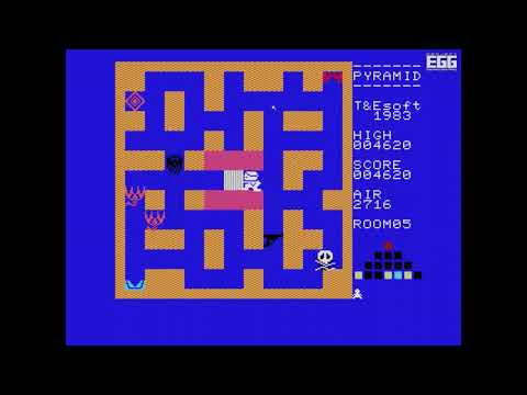 本作は1983年にリリースされたアクションゲーム。プレイヤーは冒険者を操作してピラミッドを探索し、宝探しの冒険をすることになります。各部屋にはサソリやコウモリが徘徊しているので、通路を上手く使ったり、一対のワープトンネルなどを駆使したり、宝箱に隠れたりして、やり過ごしましょう。敵に接触すると冒険者をひとり失い、すべての冒険者が倒れるとゲームオーバーとなります。