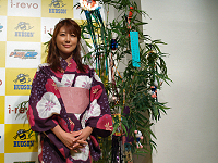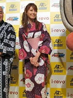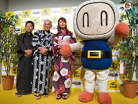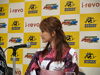 発表会会場には,ハドソン執行役員の柴田真人氏,高橋名人,タレントの安めぐみさんが,七夕らしく浴衣姿で登場。