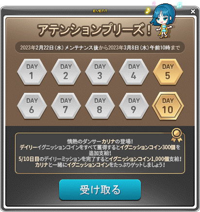 1日に獲得可能なイグニッションコインをすべて獲得したら、「アテンションプリーズ!」から追加のイグニッションコイン300個を獲得できます。さらに5回目と10回目に「アテンションプリーズ!」を完了すると、イグニッションコインを追加で1,000個プレゼントいたします。