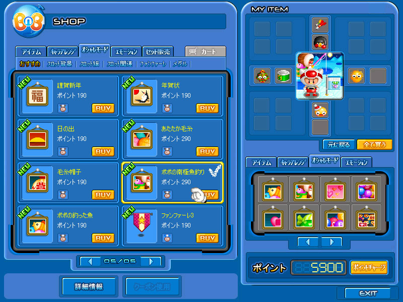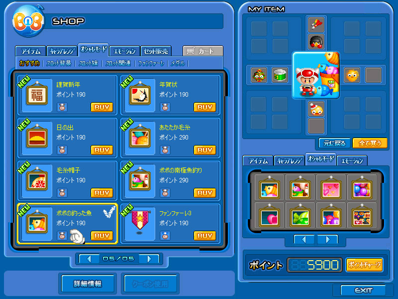 今回追加されたポイントアイテムは,新年にちなんだ"謹賀新年"や"年賀状"を始めとする7種類。毛糸など冬を意識させるものから,"ポポの南極魚釣り"や"ポポの釣った魚"といったユニークなアイテムまで用意されている。