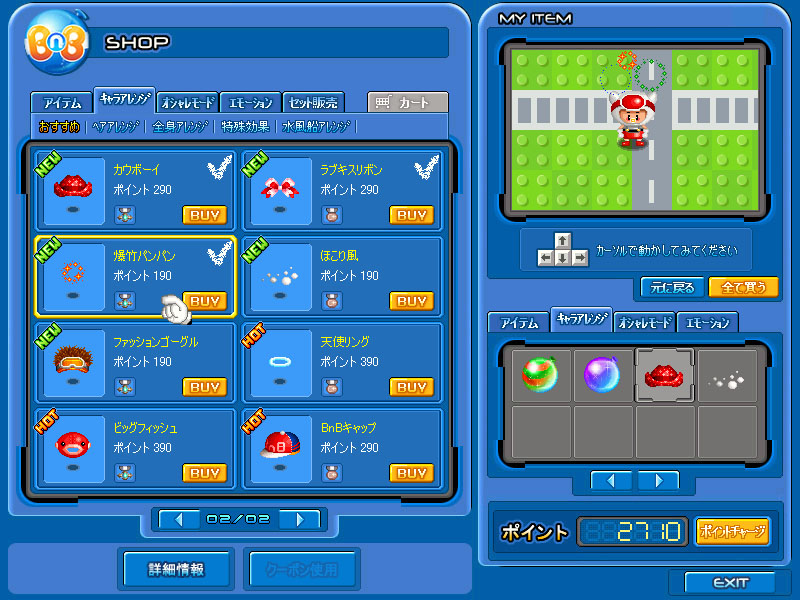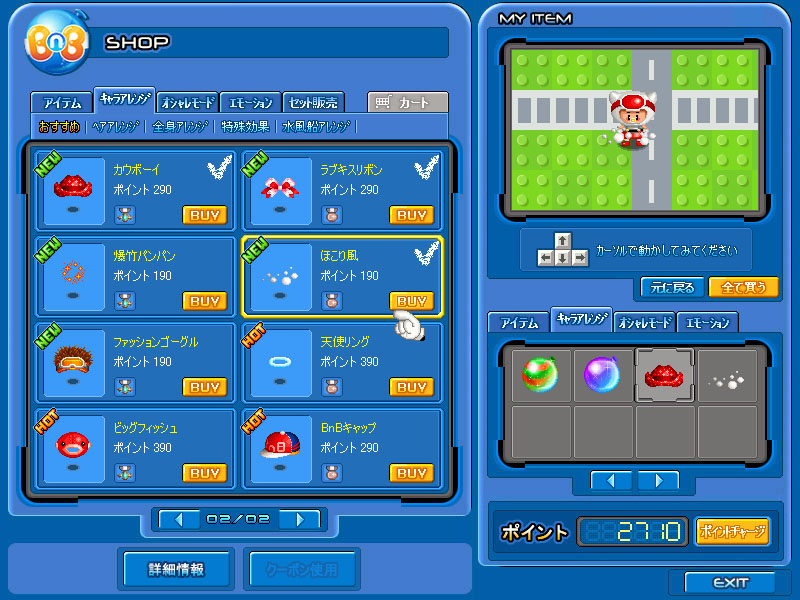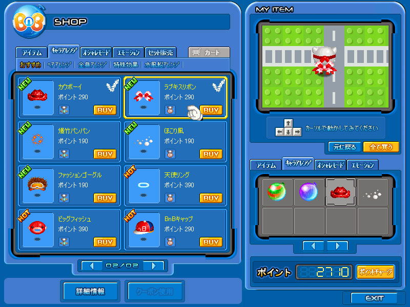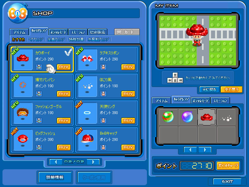 今回追加されたポイントアイテムは,ヘアアレンジの「カウボーイ」(290ポイント),全身アレンジの「ラブキスリボン」(290ポイント),特殊効果の「爆竹パンパン」(190ポイント)と「ほこり風」(190ポイント)の計4種。まぁこれらのアイテムを装備したからといって極端にキャラクターの容姿が変わるわけではないが,どれもワンポイントアクセントになることは間違いない。1ポイント=1円(購入は500ポイントから)なので,高いものでも300円以下。下に掲載した画像を見て,気に入ったものがあれば購入してみるといいだろう。(halen)