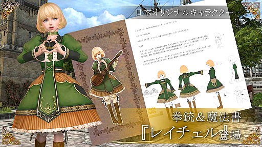 第4回キャストデザインコンテストで最優秀賞を獲得した「レイチェル」が,このタイミングで実装されることが決まった(関連記事)。天然系ドジっ子という設定の女の子だ。ルディンちゃんが大好きで追いかけて新大陸に上陸したという,なかなの情熱家だ。本来は楽器を武器に戦うキャラだったのだが,拳銃+魔法書というスタイルに仕上がっている。