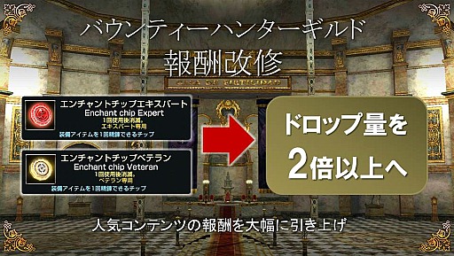 ミッション報酬の引き上げは,ブリスティアコンテンツに留まらない。人気のバウンティハンターギルドでもエンチャントチップのドロップ量が2倍以上に引き上げられる。