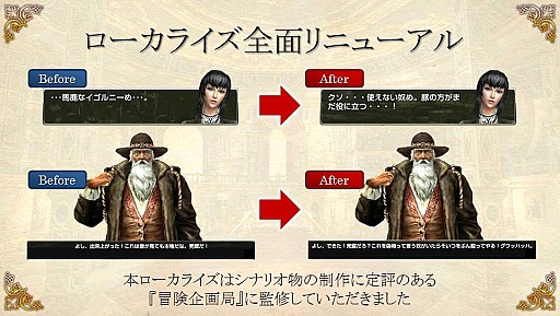 ミッション時のテキストなど,キャラクターのセリフを中心に翻訳が全面的に改善される。これにはゲームシナリオのプロ集団「冒険企画」の協力を得ての,気合が入ったものになるという。ストーリーがこれまでよりも分かりやすく,キャラクターの描き分けが綿密に行われているとのことで,ゲームを最初から遊びなおしてみるのも面白いかもしれない。