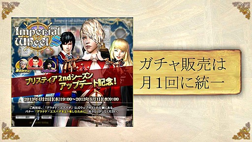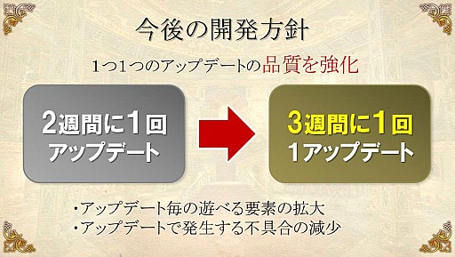 まずは,アップデート方針の変更についてだ。以前は「週間アップデート」ということで,新しいコンテンツを迅速に提供していく体制を整えていたのだが,アップデート速度にプレイヤーがついていけなくなったので,2週間アップデート体制に改められたというのは,1年半前の出来事だった(関連記事)。最近は,コンテンツ供給自体は進んでいても,そのクオリティが低下してきたということで,クオリティ維持のため開発にもっと時間をかけることになったという。今後は,3週間に1回の新コンテンツ投入のサイクルに変更される。