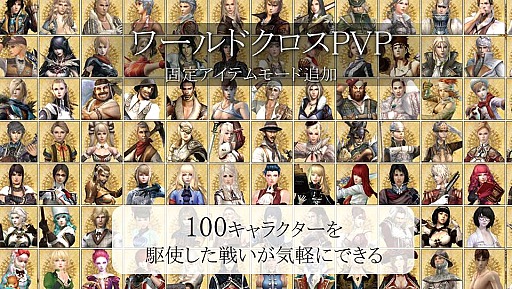 サーバーを超えて対戦できるワールドクロスPVPでは,新たに装備品を同条件にした固定アイテムモードが追加され,装備差によらない対戦が楽しめるようになるとのこと。総勢100人のキャラクターを自由に使えるので,キャストキャラクターのお試しとしても有効だろう。