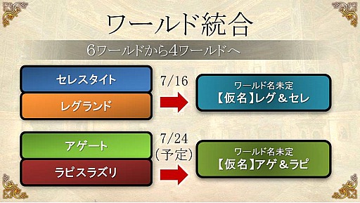 ユーザーアンケートなどの結果から,ワールド統合が決定された。現在の6ワールドから4ワールドに,具体的にはセレスタイトとレグランド,アゲートとラピスラズリの4ワールドが統合されることになる。統合により人数が増えることで,より多人数コンテンツを遊びやすくなる。ワールド自体への負荷拡大にはチャンネル数を増やすことで対応するとのこと。ワールド統合は,7月16日から実施される。