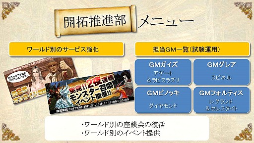 また,これらのGMには毎月の予算がvisで与えられ,それを使ったイベントなどを自由に展開できるようにしていくという。その運用方針については座談会などで決定される模様だ。それぞれのワールドで人気になったイベントは,ほかのワールドでも展開されていき,全体的にプレイヤーの満足度を上げていくとのこと。