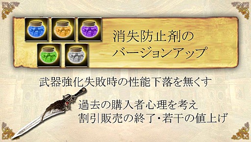 アイテム強化時の消失強化剤がパワーアップされ,強化失敗時に消失を防ぐだけでなく,アイテムのダウングレードを防止する効果を持つようになる。最大限にセットした場合は,ダウン確率がゼロになる。これによって,アイテム強化の大幅な負荷軽減が期待される。消失強化剤自体は若干の値上げが行われるとのこと。
