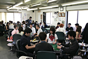 これは,"いつもはモニターの向こう側にいる女性タレント達と実際に会って対局を楽しめる"という,お馴染みのイベント。参加は予約制で,当日集まった参加者は7卓に振り分けられ,お目当ての女性タレントとの対局を楽しんでいた。