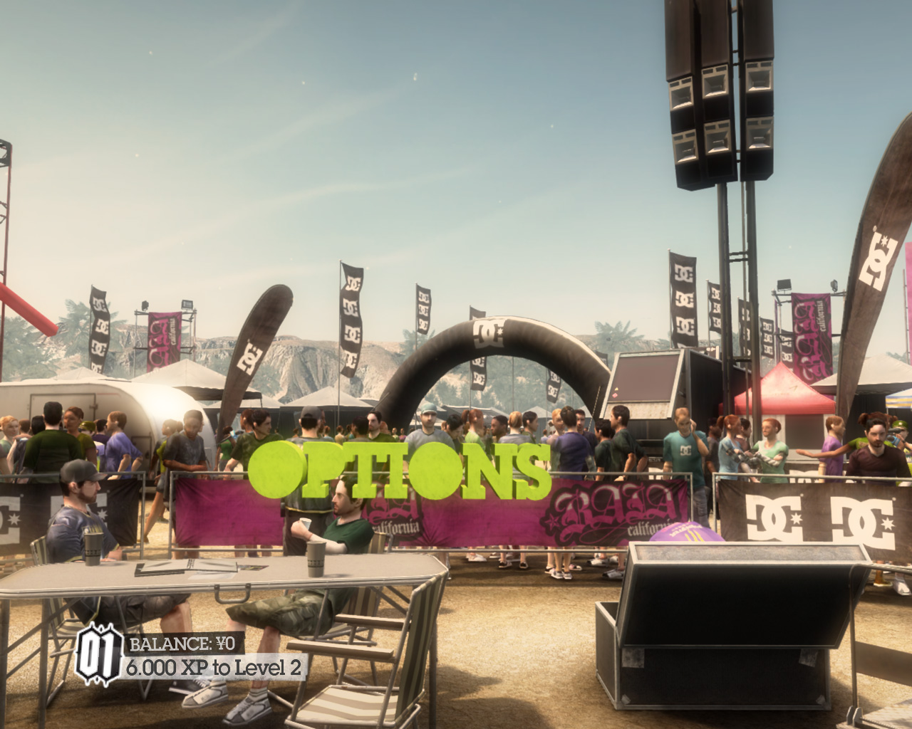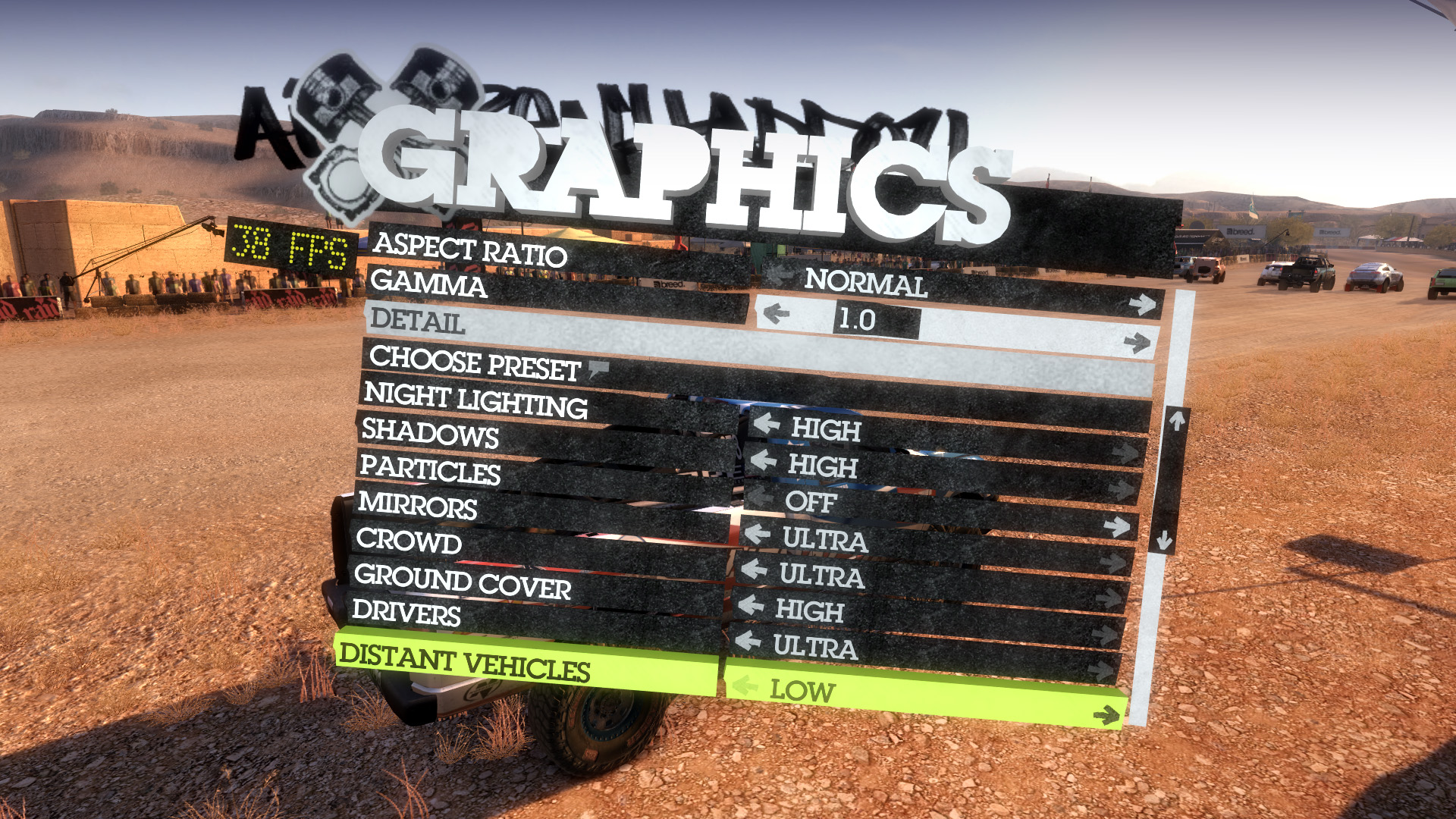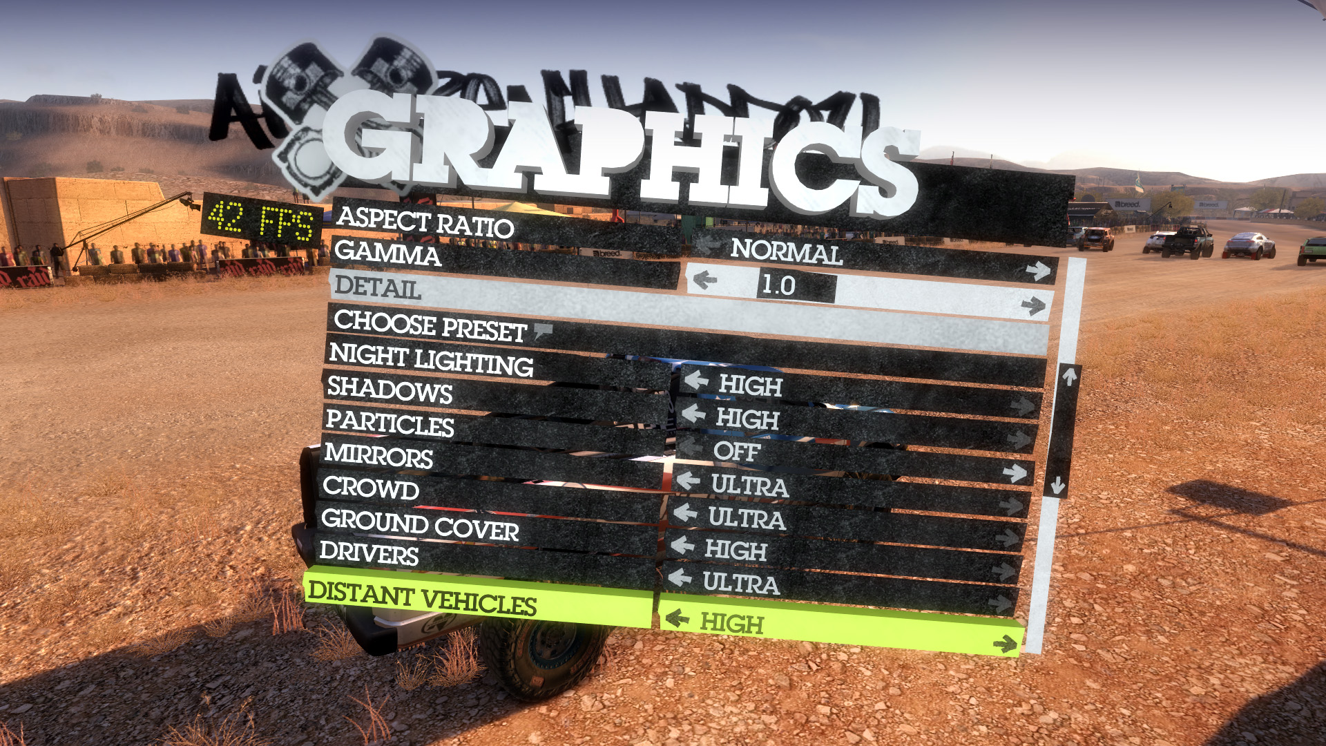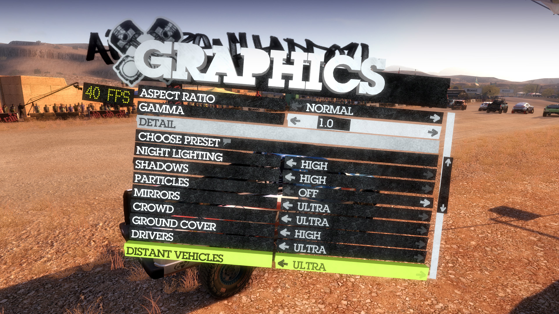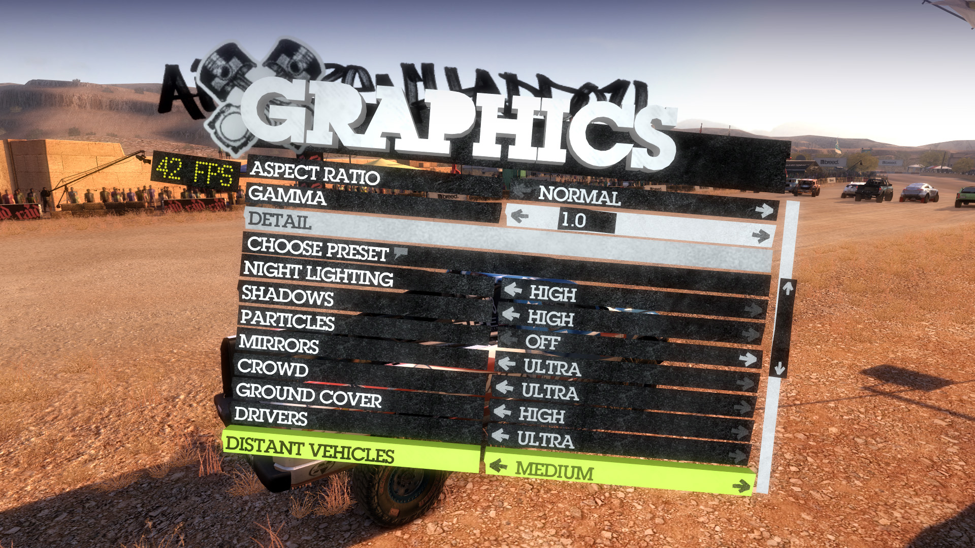DiRT 2のメニューはインゲームのGUIになっていて,早い話,グラフィックスのメニューがどこにあるのか分かりにくい。キャンピングカーを出たところにある「OPTIONS」の,さらに階層下にある「GRAPHICS」がグラフィックスオプションとなる