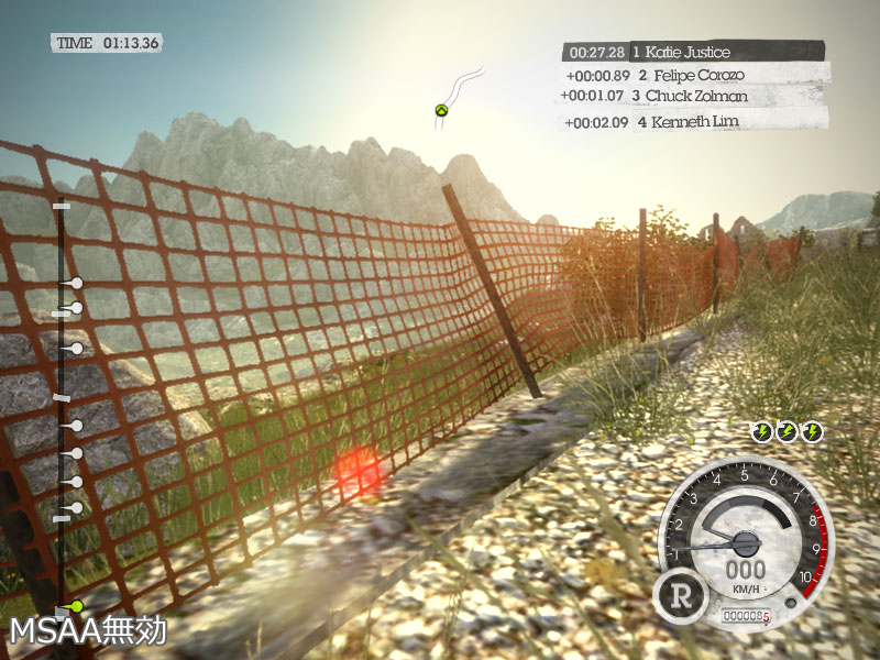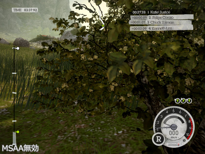 なおDiRT 2は,透明ピクセルを含むテクスチャのエッジに対してアンチエイリアシングを施す,Transparency Anti-Aliasing(トランスペアレンシーアンチエイリアシング)には対応していないようで,MSAAの設定を変えてみても,網のジャギーは低減されなかった。