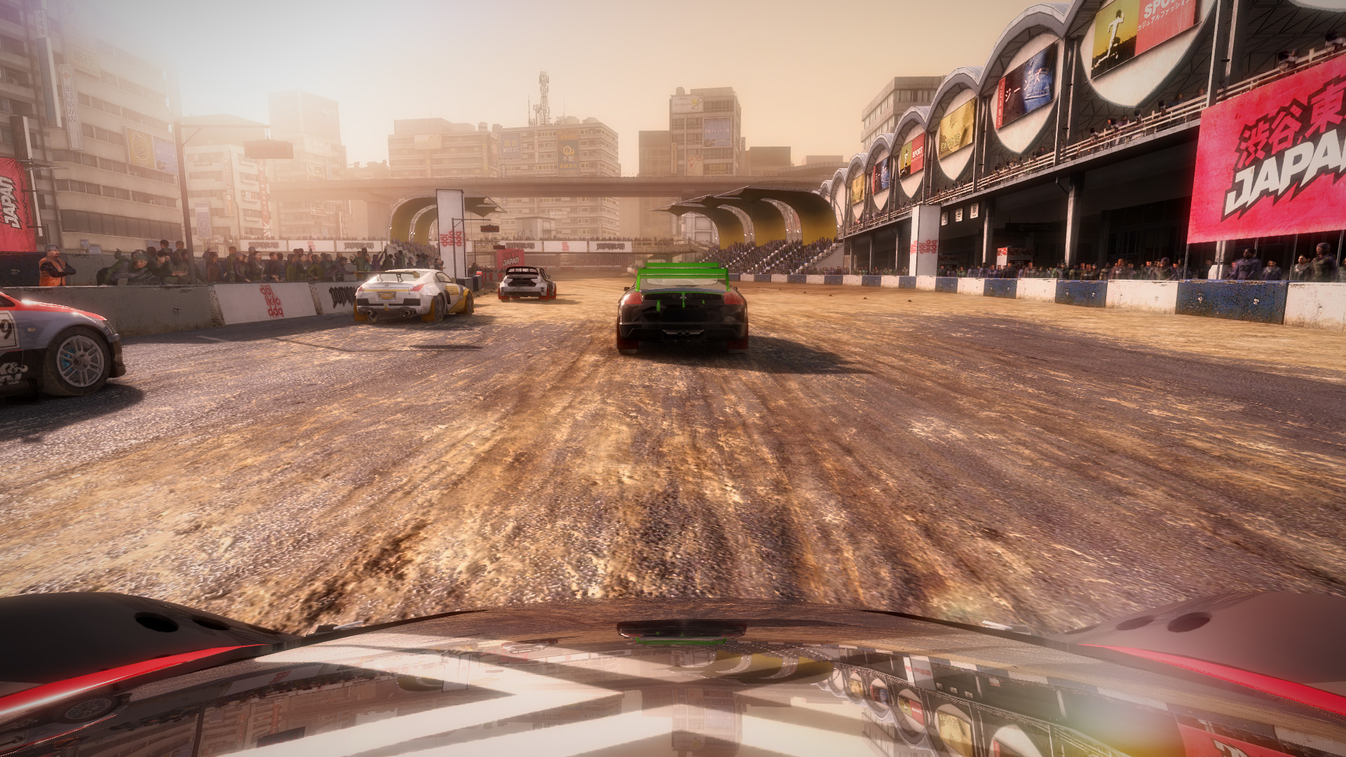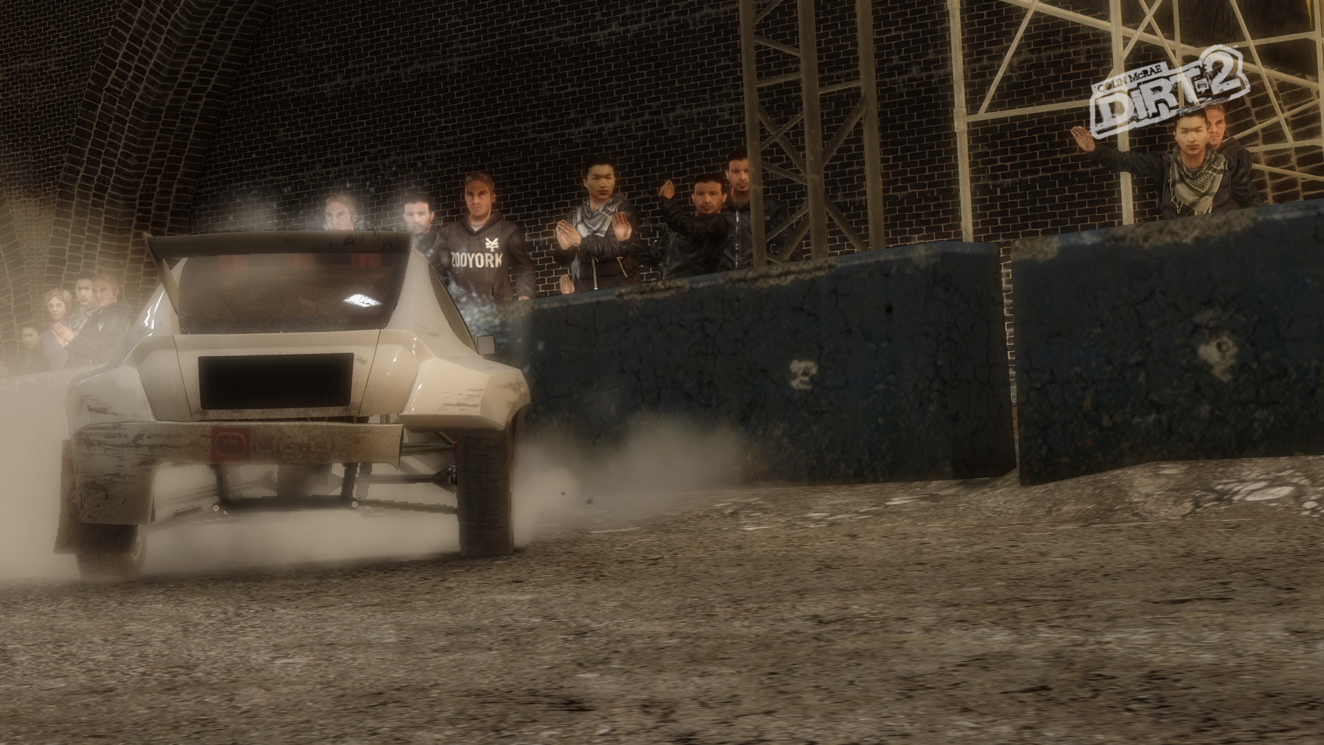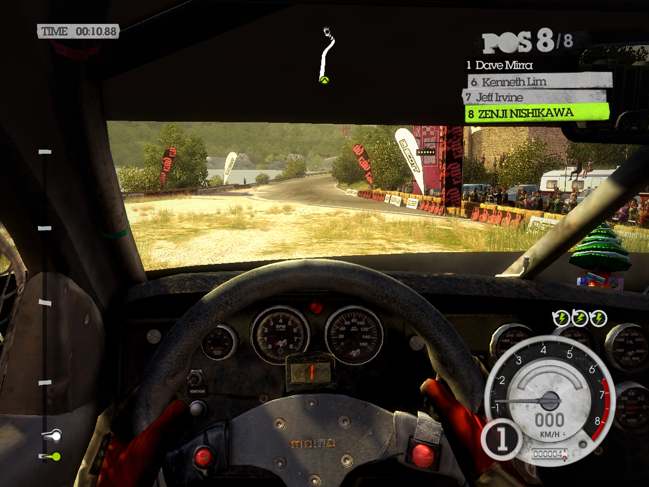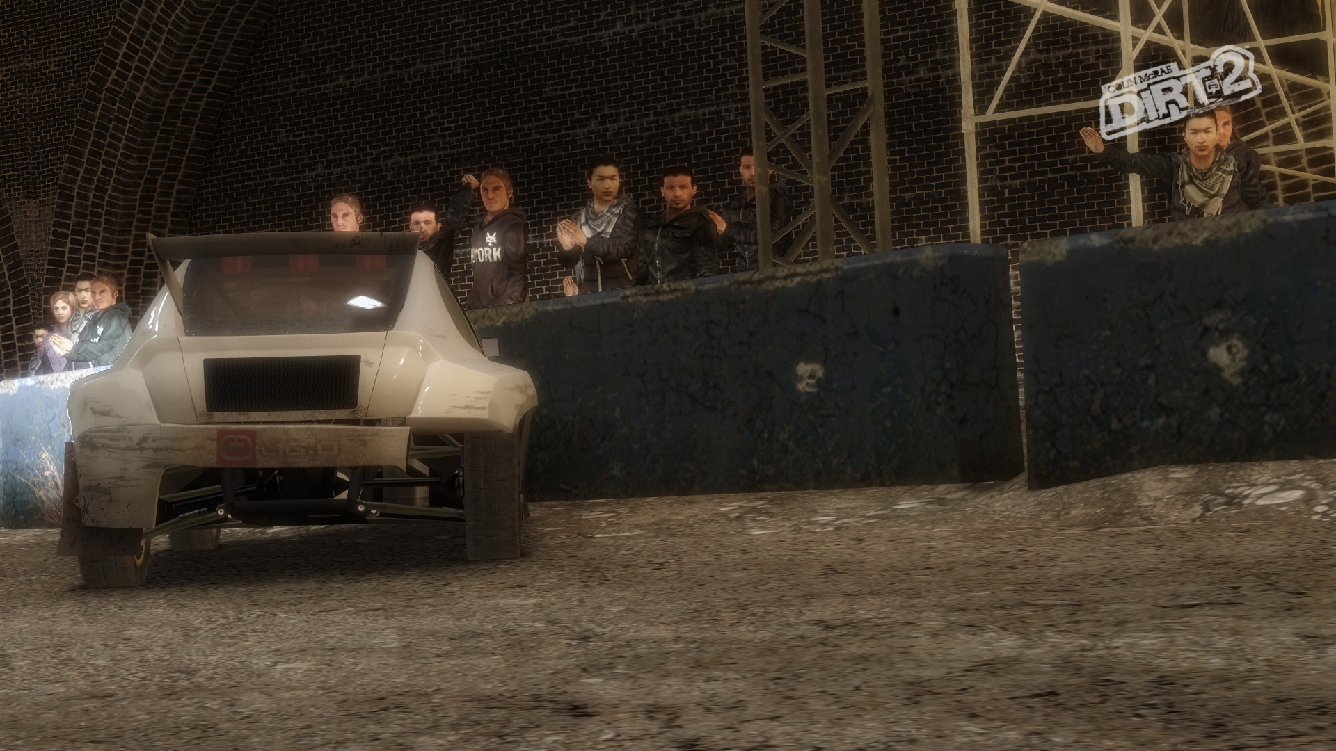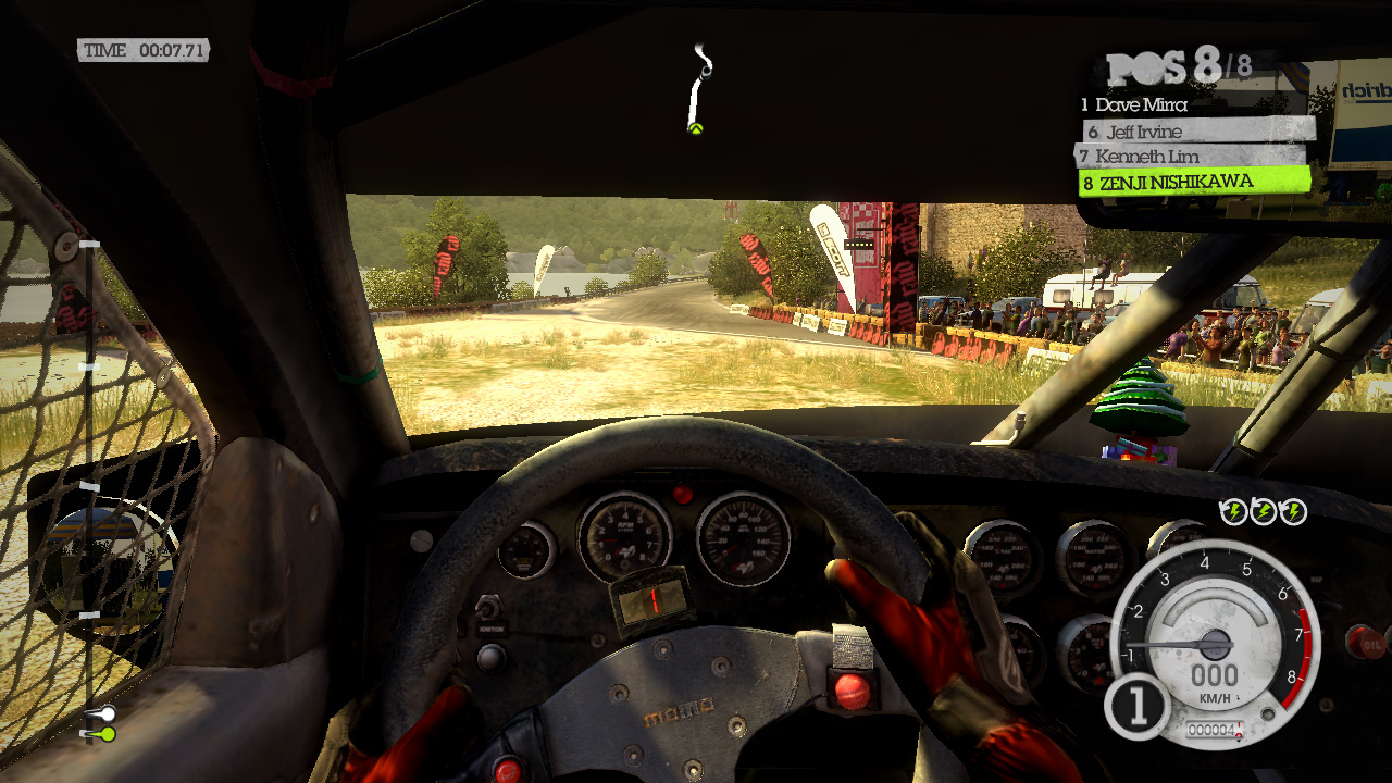 DiRT 2の影生成は,あまり高度なものではないようで,最高位設定のHIGHでも,光源が遠い影には強いジャギーが出る。さらに群衆については,どのような設定でも影生成は行われない。